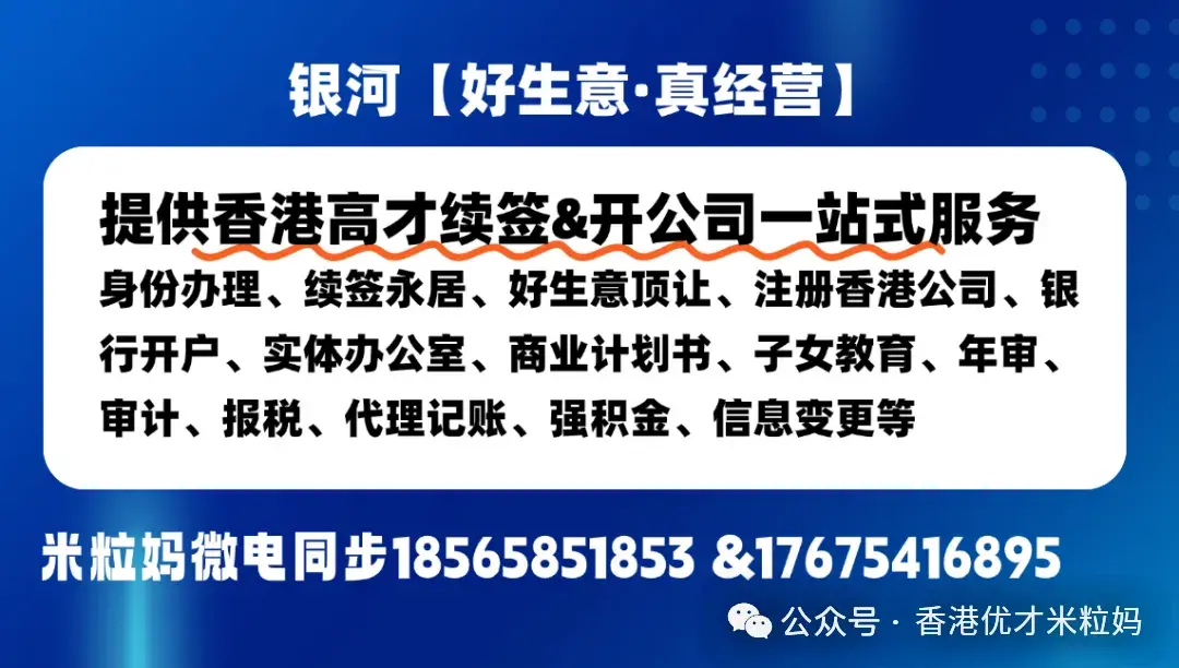 银河【好生意·真经营】提供香港身份续签、转永居、注册香港公司、开户、商业计划书、公司财税合规运营(年审/审计/报税/代理记账/强积金等)、税务规划、租赁实体办公室、子女教育全链条服务,如需咨询欢迎随时DD银河米粒妈。银河集团高才续签咨询热线:18565851853 &17675416895