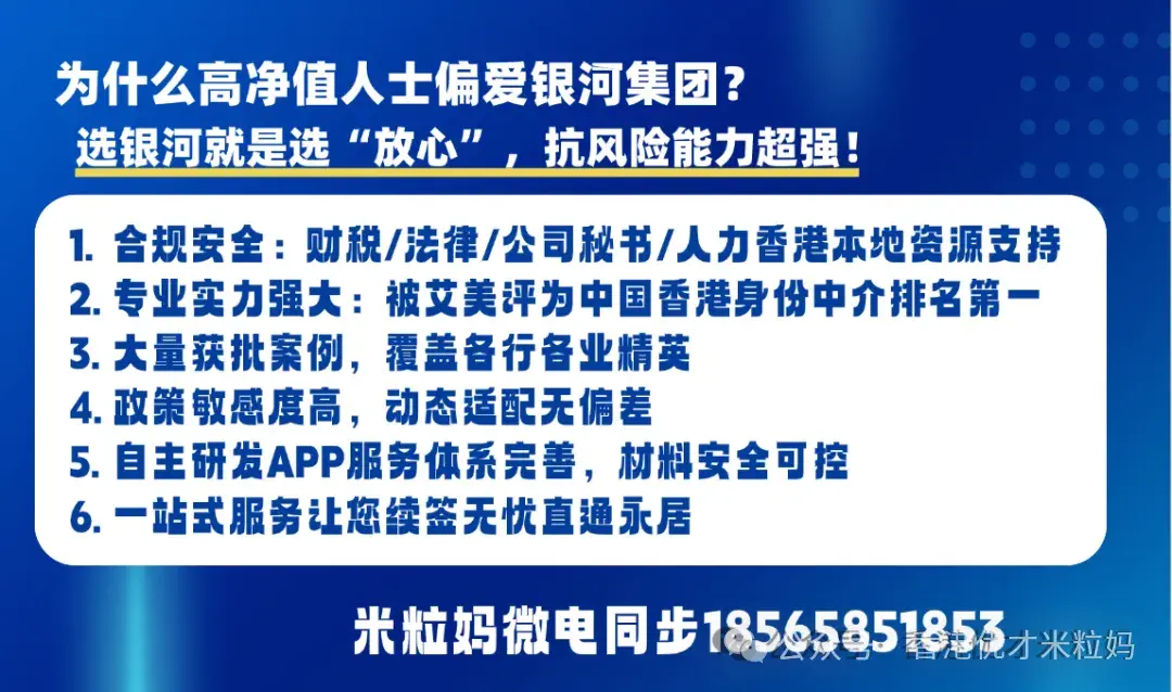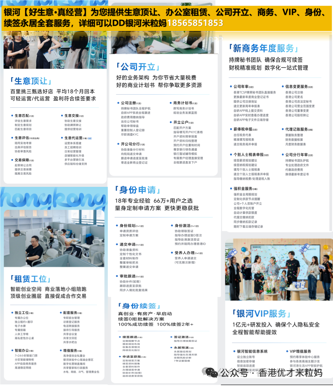 银河集团香港身份办理、创业和续签都找银河集团,从香港身份办理、选项目、收购店铺、租赁办公室、到后期招人、商务服务、公司代理运营管理,续签和永居手续办理, 银河集团全都帮您搞定。选银河不仅是选一个服务机构,更是选一个懂香港、懂创业、懂续签的长期伙伴!银河【好生意·真经营】=身份到手+创业成功+顺利续签转永居。想要了解银河集团【好生意·真经营】项目可以加银河米粒妈微信详细沟通(18565851853&17675416895)