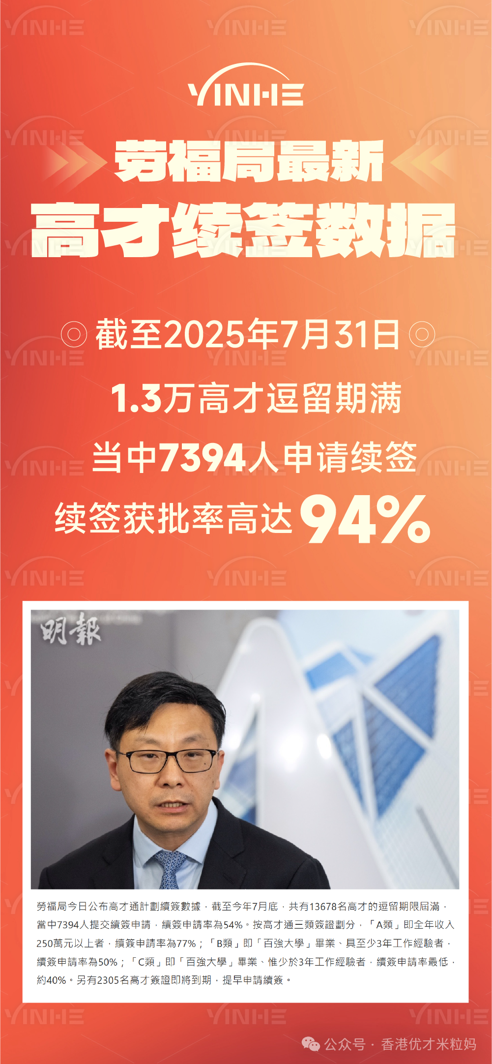 03、高才续签通过率 ——香港劳福局最新公布:截止到2025年7月31日,有13,678名高才逗留期满,7,394人申请续签(54%),续签获批率高达94%!孙玉菡局长表示:续签情况理想,符合预期。