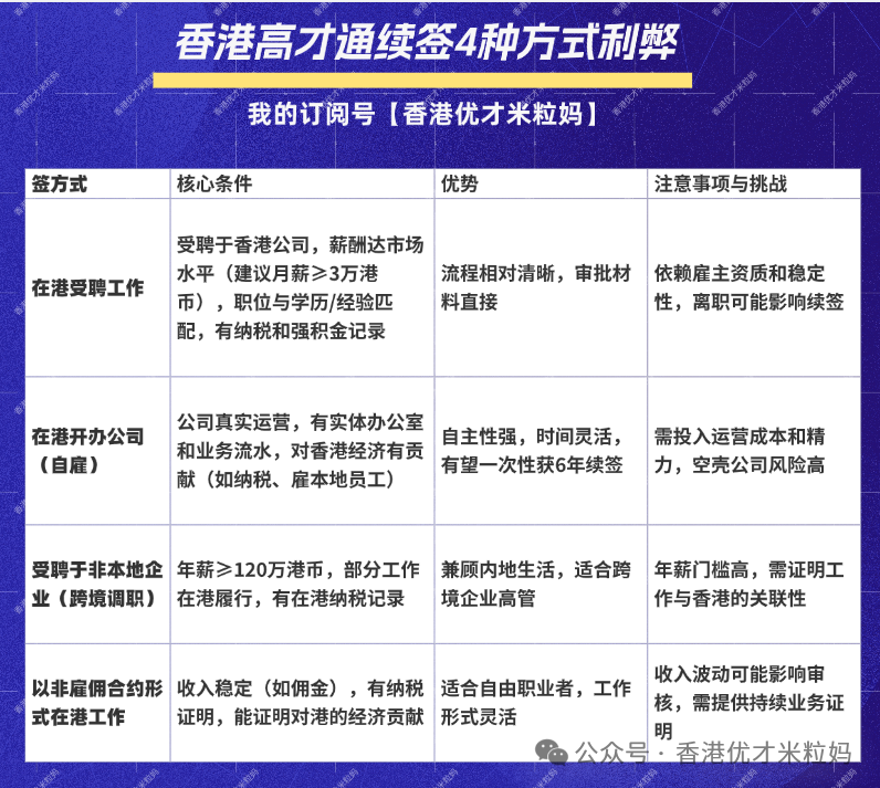 高才通续签方式有4种,常用的续签方式是赴港就业续签和创业续签。如果你长期不去香港,可以选择创业续签高才,创业续签因为贡献度更大,更受香港入境处认可,通过率更高,获批逗留时间更长。另外创业续签自主性更强,自己可以灵活把握,而不必受制于雇佣公司。 创业续签的弊端是流程比较复杂,成本比较高,适合有一定经济基础的朋友。