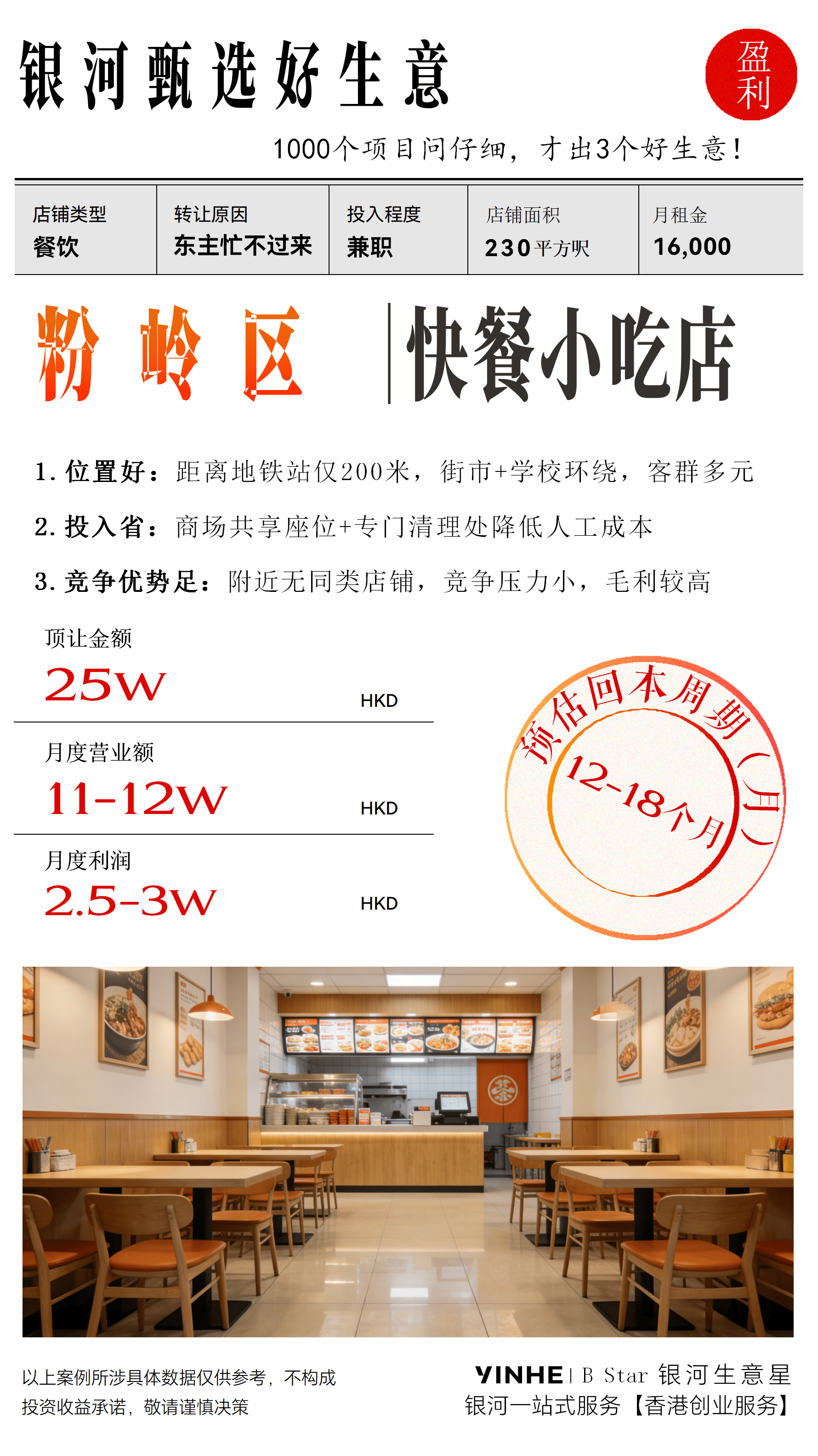 在香港繁华的北区,粉岭区以其独特的地理位置和浓厚的生活氛围,成为了众多商家竞相入驻的热门地段。而在这片充满活力的区域中,一家已经成熟运营两年的快餐小吃店正等待着新的主人。