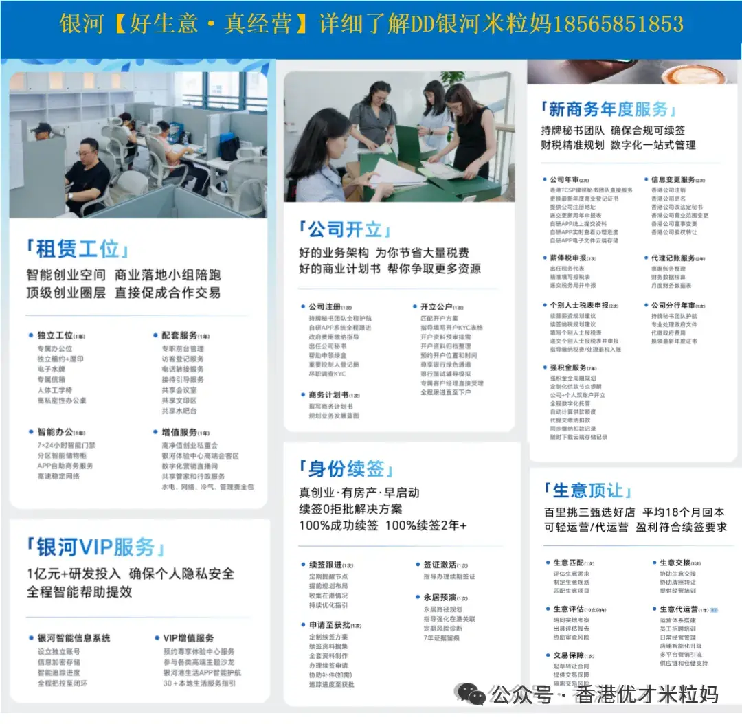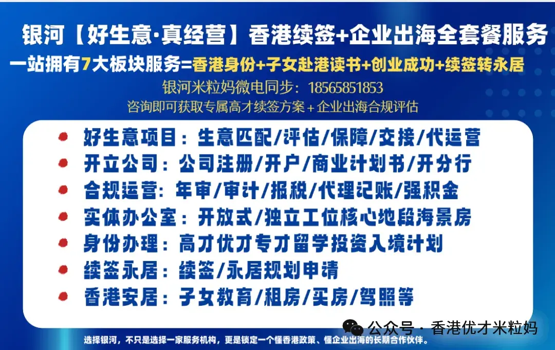 银河【好生意·真经营】提供香港身份续签、转永居、注册香港公司、开户、商业计划书、公司财税合规运营(年审/审计/报税/代理记账/强积金等)、税务规划、租赁实体办公室、子女教育全链条服务,如需咨询欢迎随时DD银河米粒妈。银河集团高才续签咨询热线:18565851853 &17675416895
