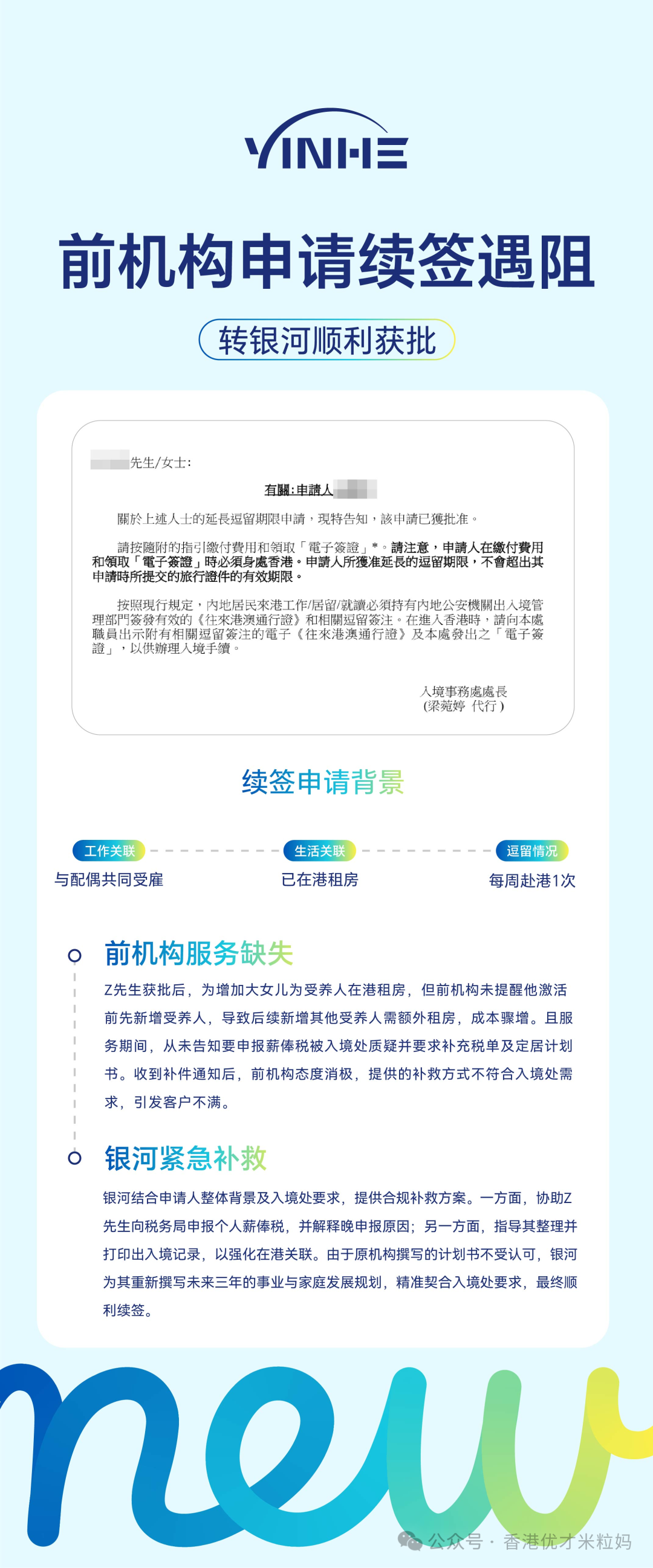 Z先生通过高才通计划获批香港身份后,与配偶共同受雇于香港公司,并在港租房以强化生活关联。他每周赴港1次处理业务,同时为子女教育新增受养人(大女儿)。然而,前服务机构存在重大疏漏:未提醒Z先生需在激活签证前完成受养人添加,导致后期额外租房成本增加;且从未指导其申报薪俸税,埋下续签隐患。