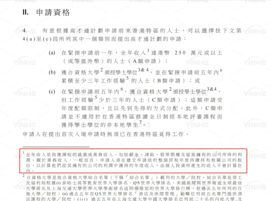 2025年5月,针对A类申请人(高收入人群),入境处进一步明确了250万港元年收入的计算标准。 新政策要求以公司收入申报的申请人"在递交申请前的整个评税年度持续持有相关公司股份",才能计算从其拥有公司的利润中获得的年度收入。这一调整旨在防止短期股权操作获取申请资格的情况。