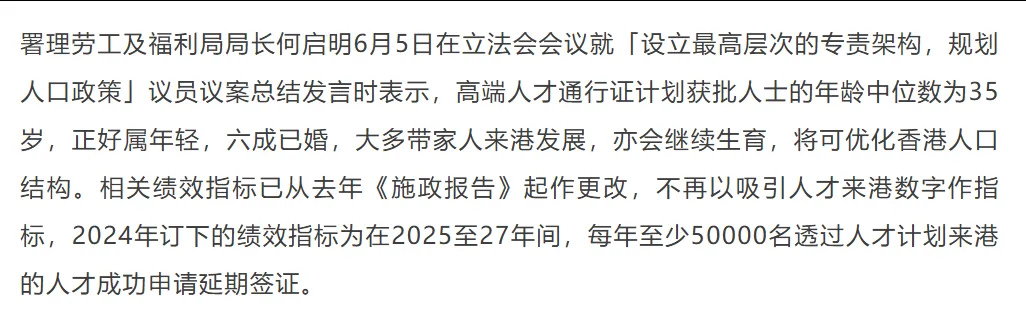 此前,港府已经明确表示,当前香港高才通计划的工作重点,已经从“抢人”转向“续签”,不再以吸引人才来港数字作指标,在2025至27年间,每年至少50000名透过人才计划来港的人才成功申请延期签证。