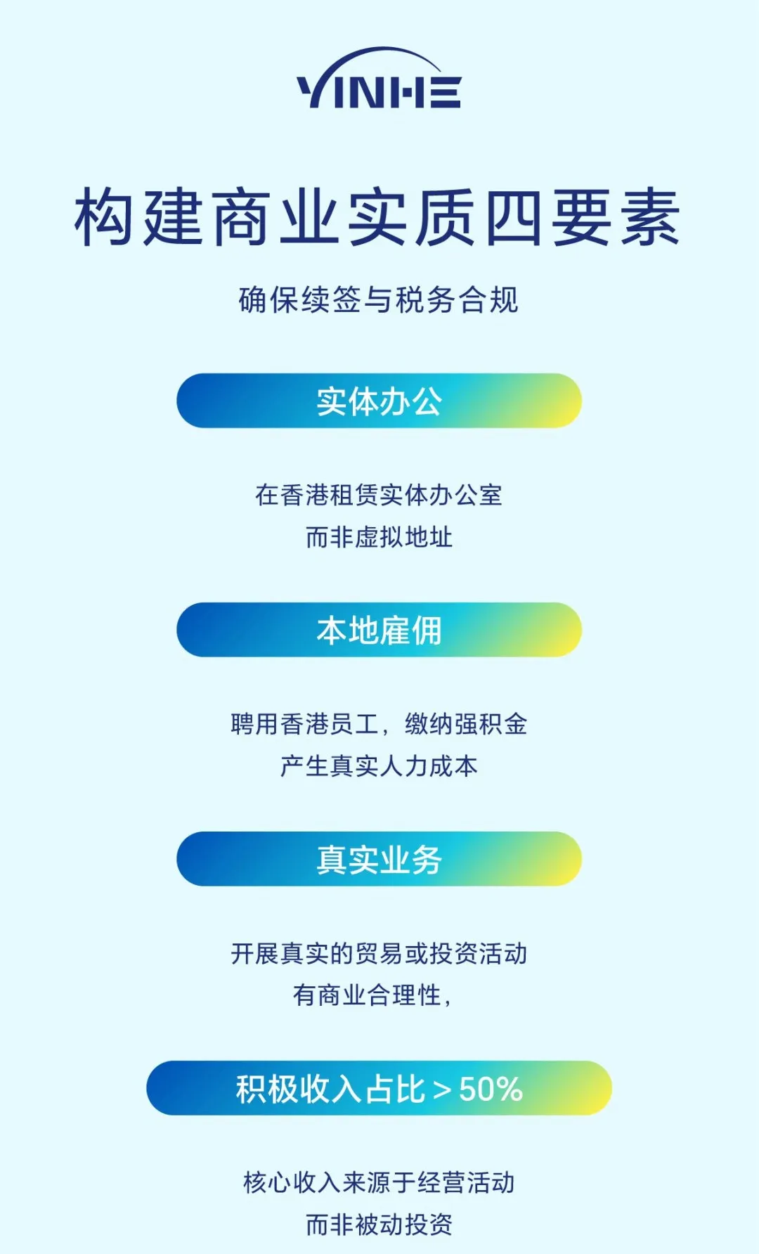 注册材料 银河集团会协助您完成香港公司注册、申请公司账户、撰写商务计划书,将公司基础搭建起来,帮助创业者节省大量税费,争取更多资源。 2、搭建符合要求的在港运营与管理体系 这一步是申请的基础,要先让公司满足 “实际管理控制地在香港” 的核心判定标准。 首先需在香港设立固定办公场所,签订正式租赁协议并留存缴费凭证,同时雇佣本地员工,保留强积金缴纳记录、劳动合同等,以此证明实地运营。 其次确保核心管理活动在港开展,比如定期在香港召开董事会并详细记录会议时间、地点、决策内容,高管需常驻香港并准备住址证明(如水电账单、银行对账单)。 银河创业共享空间位于香港湾仔谢斐道303号银河大厦,有共享工位或独立办公室两种形式,针对香港写字楼高租金痛点,推出 “适配型” 租赁方案,兼顾成本与合规性。 3、公司合规维护及经营 香港公司合规维护集中在年度核心事项、日常变更备案、银行账户维护等方面。 银河集团可提供 “一键全包” 的年度经营维护服务,可选2-7年服务,涵盖公司年审、薪俸税申报、个人税表申报、强积金管理、公司信息变更、代理记账及分行年审等全方位保障,免除琐事干扰。 4、备齐各类合规证明文件 提前梳理并核对材料,避免因材料缺失延误审核。必备材料包括三类: 一是主体资质文件,如公司注册证书、商业登记证、最新周年申报表; 二是管理与运营证明文件,像董事会会议记录、办公场所租赁合同及水电费单、员工强积金缴纳记录、高管的香港居留或居住证明; 三是财务与业务文件,涵盖近三年的审计报告、财务报表、香港银行账户流水、主要业务合同(如进出口合同、客户协议)等,若有跨境业务,还需补充海关报关记录等业务真实性证明。 5、申请税务居民,如实填报信息 登录香港税务局官网下载对应申请表,香港成立的公司需填写 IR1314A 表格,若公司未在香港注册但实际管理在港,则填写 IR1313B 表格。表格填写时要重点明确公司管理与控制地点,比如注明 “董事会每月在香港 XX 办公地点召开”,同时标注适用的避免双重征税协定相关条款,确保信息与佐证材料一致,无填写错误或信息矛盾。 6、线上递交至税务局 线上可登录香港税务局 eTAX 系统,选择 “申请居住地证书” 板块,上传填好的申请表及所有材料的 PDF 电子版,提交后可记录申请编号,便于后续查询进度。 7、及时补充材料并回应核查 税务局一般会在 21 个工作日内初步核对材料完整性,审核期间,若税务局对公司的管理真实性、业务合规性有疑问,会通过邮件或电话通知补充材料,比如进一步提供特定业务的收入凭证、员工工作记录等,需及时回应并补齐材料,保障审核顺利推进。 8、领取证明 若审核通过,税务局会发放电子版《香港税收居民身份证明书》,若申请时注明需要纸本,还会邮寄纸质版文件,该证明有效期通常为 3 年。领取后需妥善留存,后续享受税收协定优惠、办理跨境业务时可能需出示该证明;且有效期届满前,若仍需维持税收居民身份,需提前筹备材料重新申请。 面向真经营客户,银河提供八大权益,涵盖税收居民身份申请、工位使用权、劳工险咨询、牌照咨询服务等,全程有专业团队跟进: 银河集团提供从公司架构设计、资金流规划、利润分配优化,到全程税务合规申报的全套解决方案。无论是中小卖家,还是大型跨境企业,我们都能帮你把每一笔收入放在合理位置,让业务合规又高效。 想让香港公司真正发挥价值、守住合规底线?找银河集团,全程帮你把税务、资金和业务安排好,让跨境生意跑得更顺、更稳。