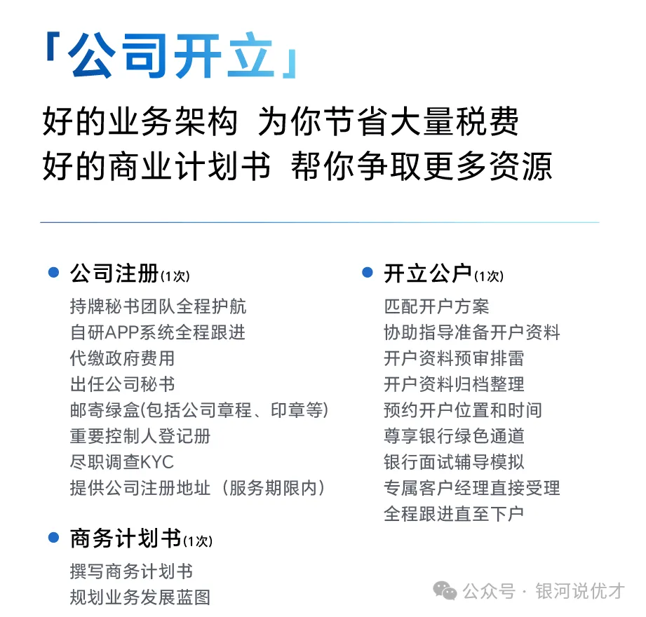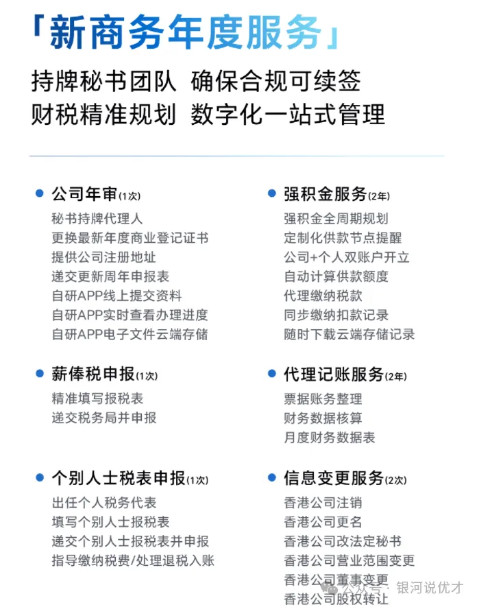 银河集团提供一站式香港创业服务套餐,涵盖香港公司注册、顶让生意、银行开户、税务规划及申报、强积金申报、公司年审、审计、代理记账、办公室租赁等,不管你在香港是否有公司、是否有业务、是否有身份,欢迎找银河君(电话/微信:17319271820)匹配适合您的创业服务: