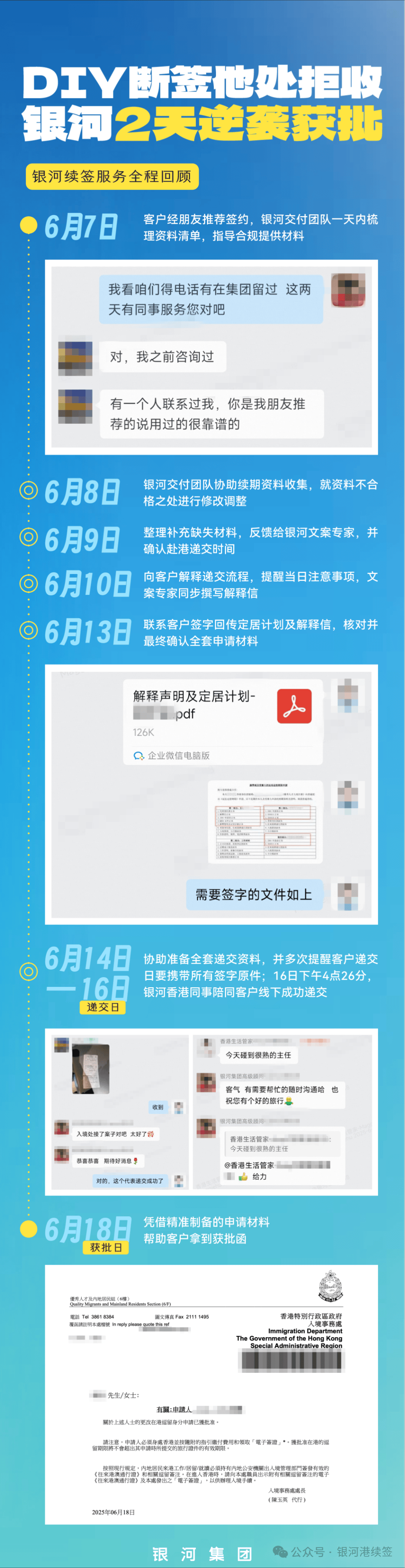 结果:银河凭借资深经验分析客户情况、精准制备申请材料,成功帮助客户拿到续签获批函。