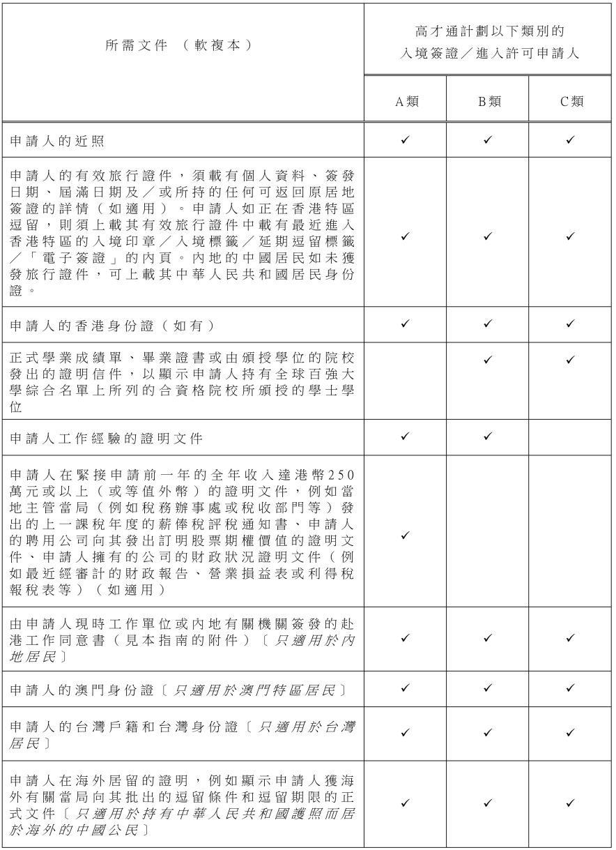 通用材料:近照、有效旅行证件(内地居民可提供身份证)、学历证书及认证文件(第三方认证或院校认证,需支持在线验证)、收入证明(A类需税单、银行流水或公司财务报告;B类需工作经验证明,如劳动合同、离职证明)、内地居民赴港工作同意书。