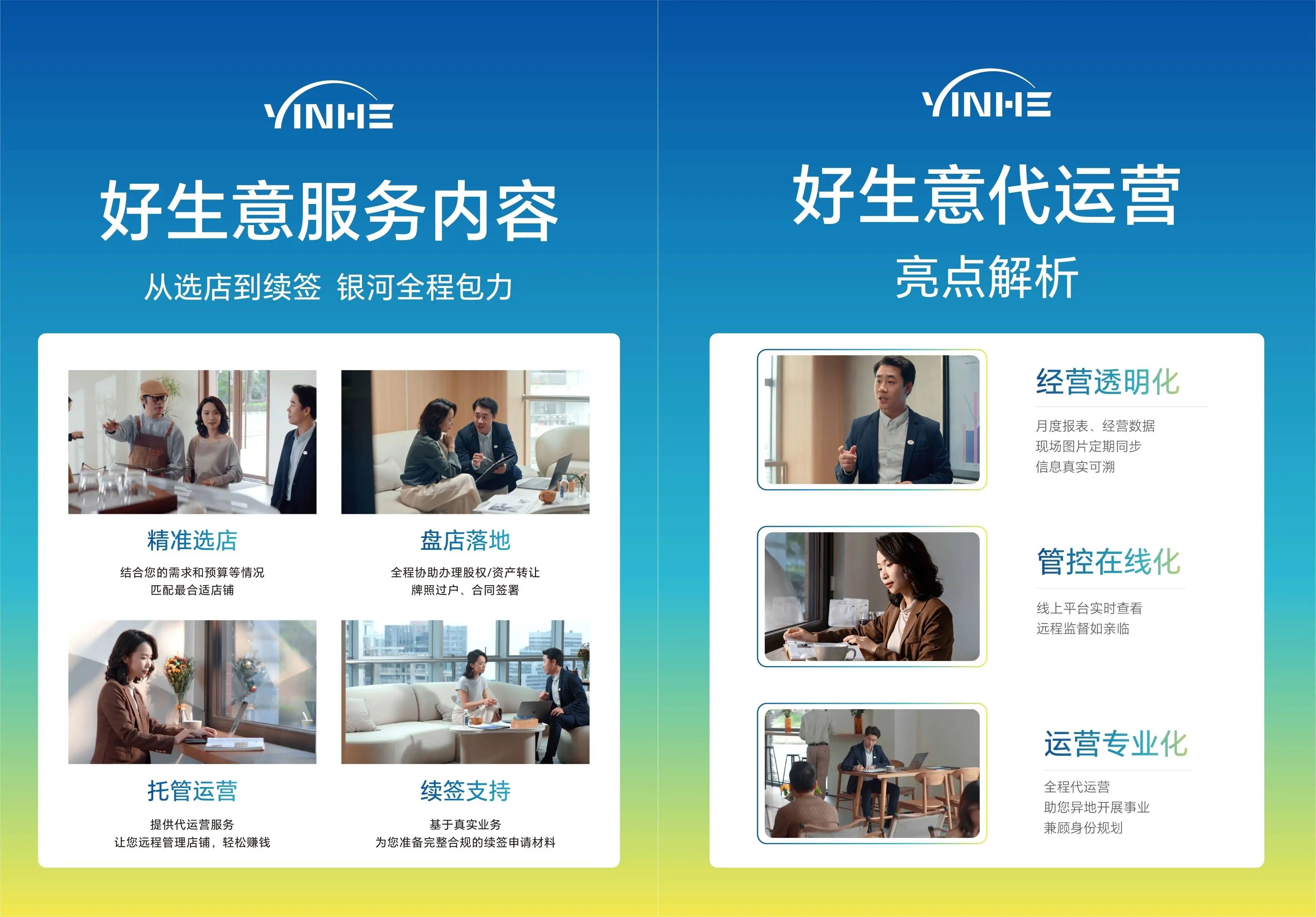 “好生意”创业续签:提供香港生意续签服务,根据客户的投资预算及能力方向匹配合适生意的项目,在选择前会为你尽职调查财务及经营状况,同业数据比对评估真实性,让你投资不惧踩雷,银河专业团队与原东主提供 N对1经营指导,帮助你的事业无缝衔接,完成业务转移。