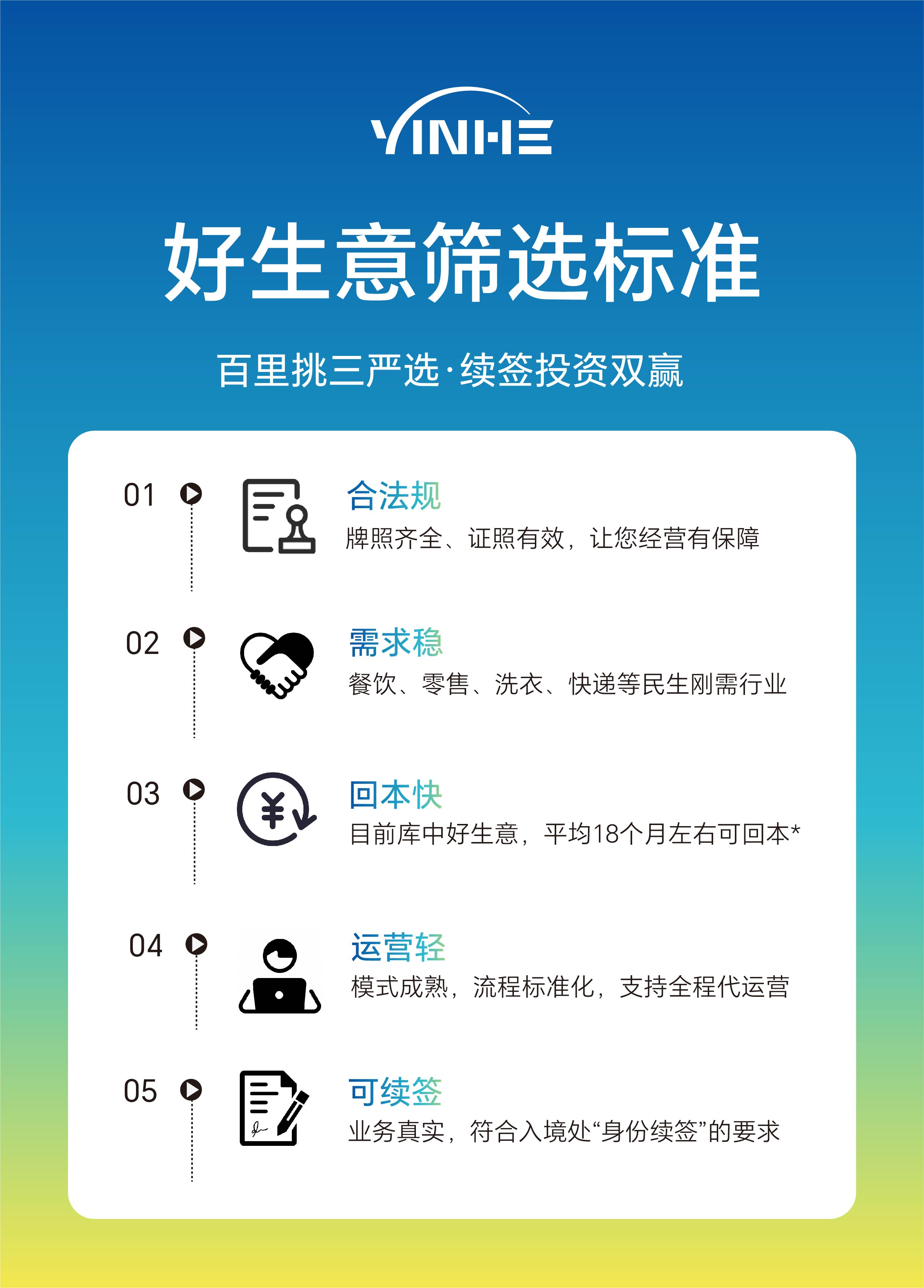 银河的【好生意】产品可以协助申请人快速找到符合自己需求、正在运营且盈利的成熟生意项目,一般是连锁餐饮、便利店、自助洗衣店或教育机构等轻投资、容易赚钱,也能满足续签要求的生意项目。