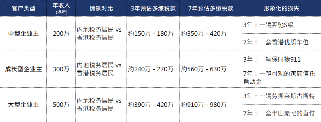 下表以三位典型的企业主为例,对比了在“仅获永居身份但被判定为内地税务居民”与“成功规划成为香港税务居民”两种情况下,3年及7年周期内的个人所得税(薪俸税)估算差异。计算基于简化模型,忽略免税额与专项扣除,采用内地最高45%综合所得税率与香港15%标准税率(或2%-17%累进税率)估算。