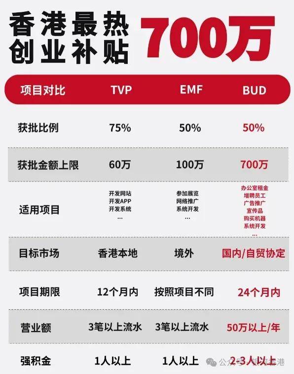 香港政府为吸引外来人才和资金,提供了多项政策扶持。例如,针对中小企业的补贴计划,如香港BUD专项基金、中小企业市场推广基金(EMF)等,这些补贴有助于降低企业的运营成本,促进企业的快速发展。