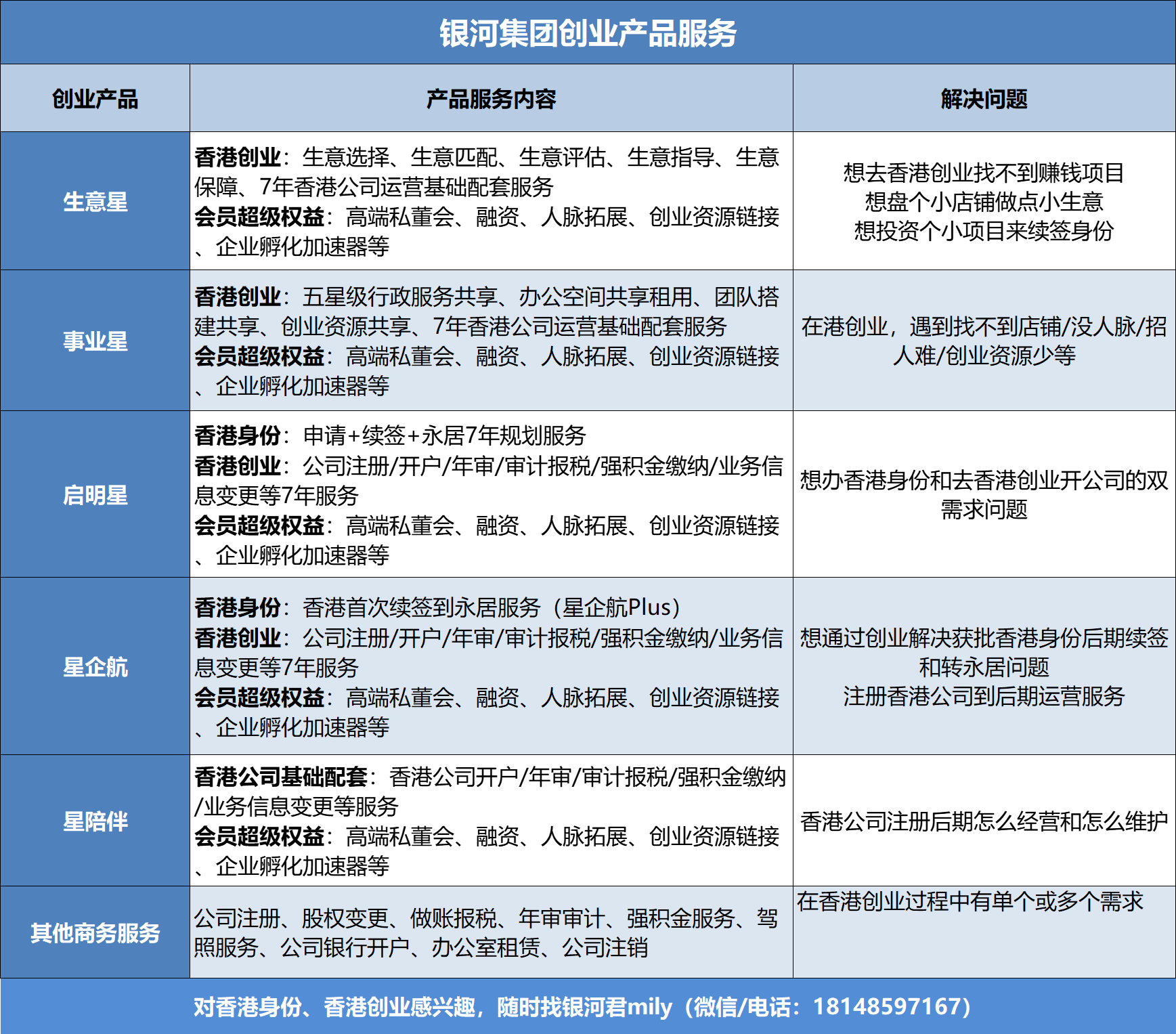 银河集团提供多种商务服务,包括香港公司注册、香港公司开户、年审、做账审计、薪俸税/利得税表申报、缴纳强积金、公司变更等多项企业服务。如果你想从0开始创业,也有创业套餐!